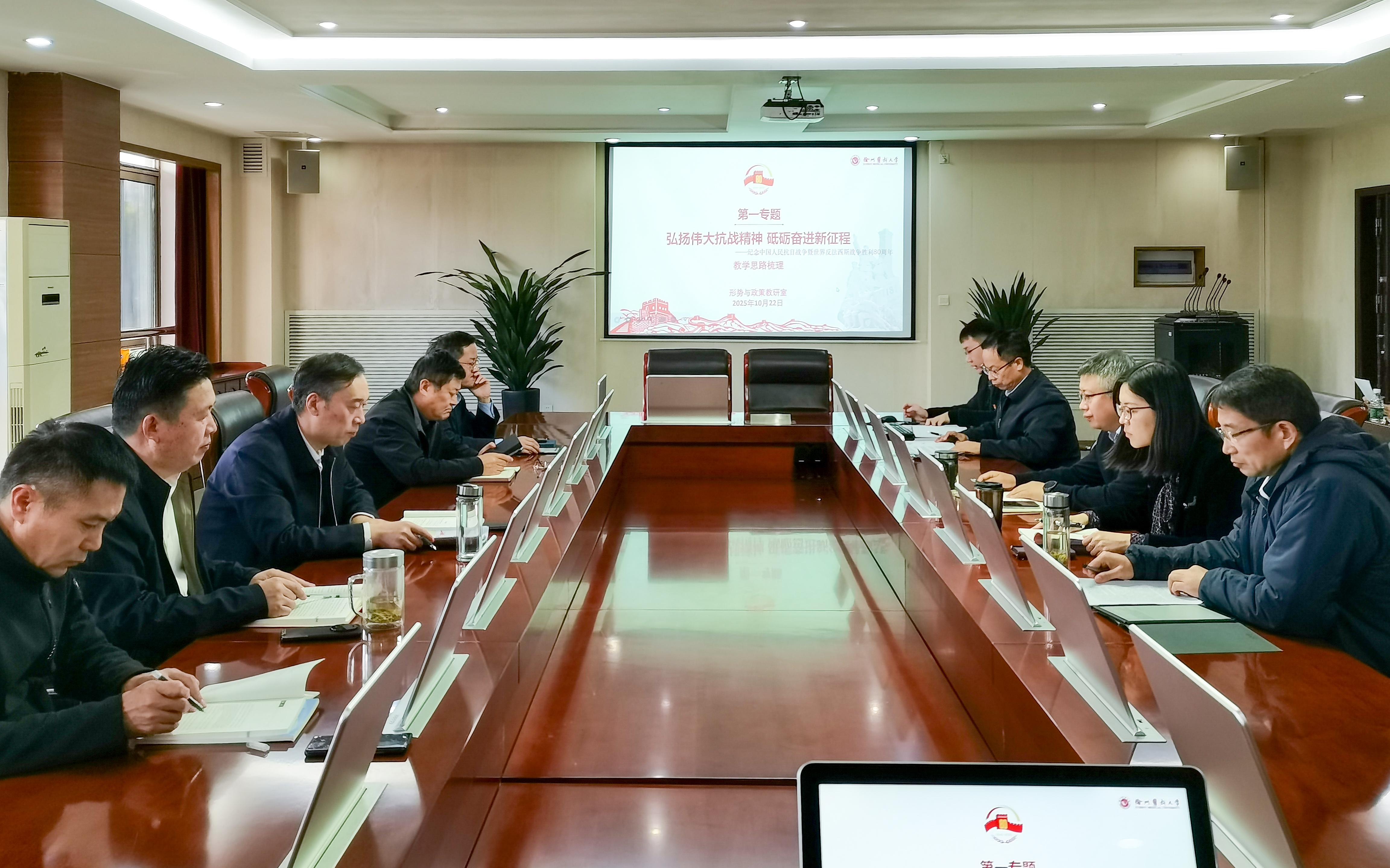 为深入学习贯彻习近平总书记在纪念中国人民抗日战争暨世界反法西斯战争胜利80周年大会上的重要讲话精神,加强我校《形势与政策》课程建设,提升教学的针对性和实效性,10月22日下午,《形势与政策》课程第一专题集体备课会在行政楼403会议室召开,校领导和专题任课教师参加。会议由马克思主义学院副院长刘万路主持。