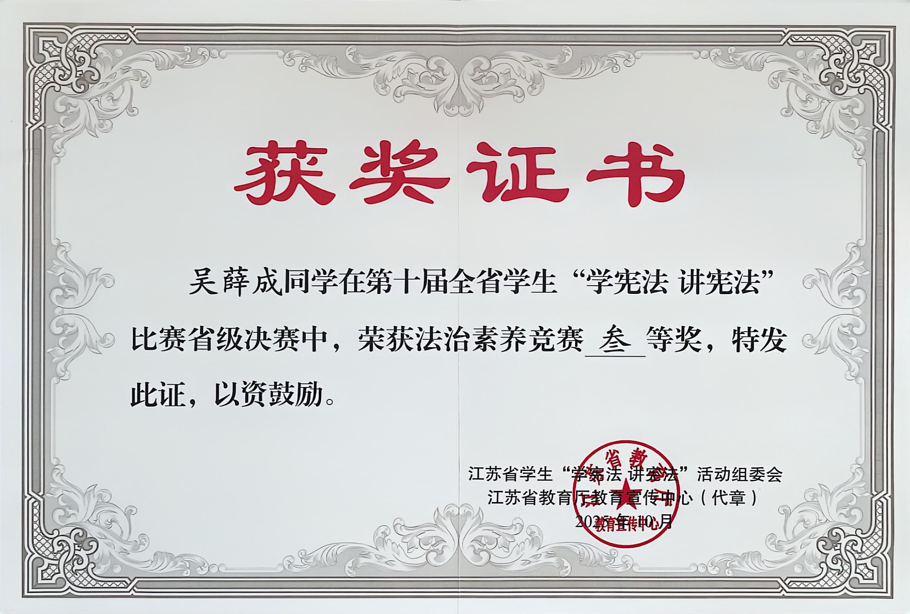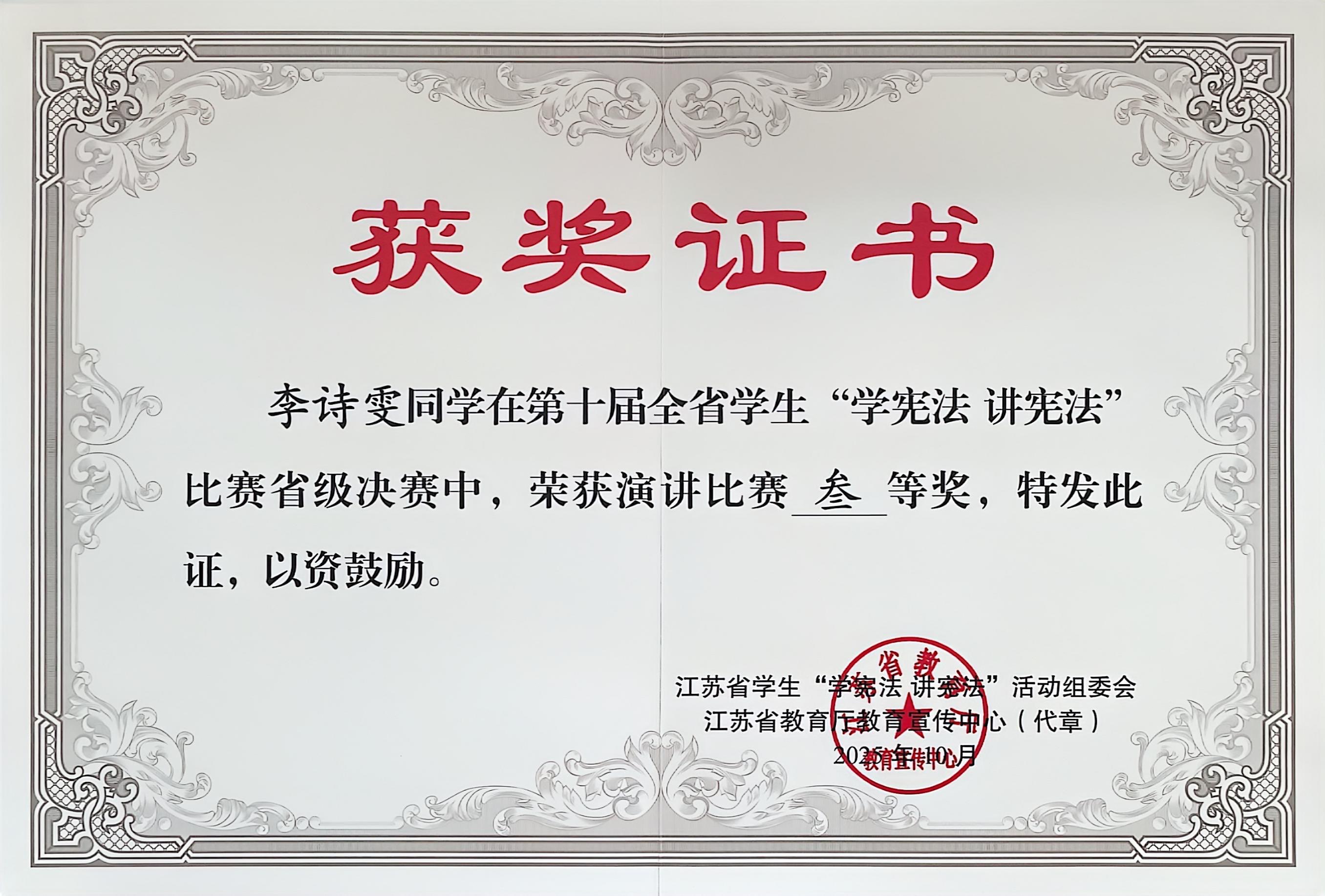 近日,由江苏省教育厅主办的第十届全省学生“学宪法 讲宪法”比赛圆满落幕。马克思主义学院鹿存礼指导的生命科学学院李诗雯同学、麻醉学院吴薛成同学分别在高校组演讲比赛、法治素养竞赛中斩获三等奖。